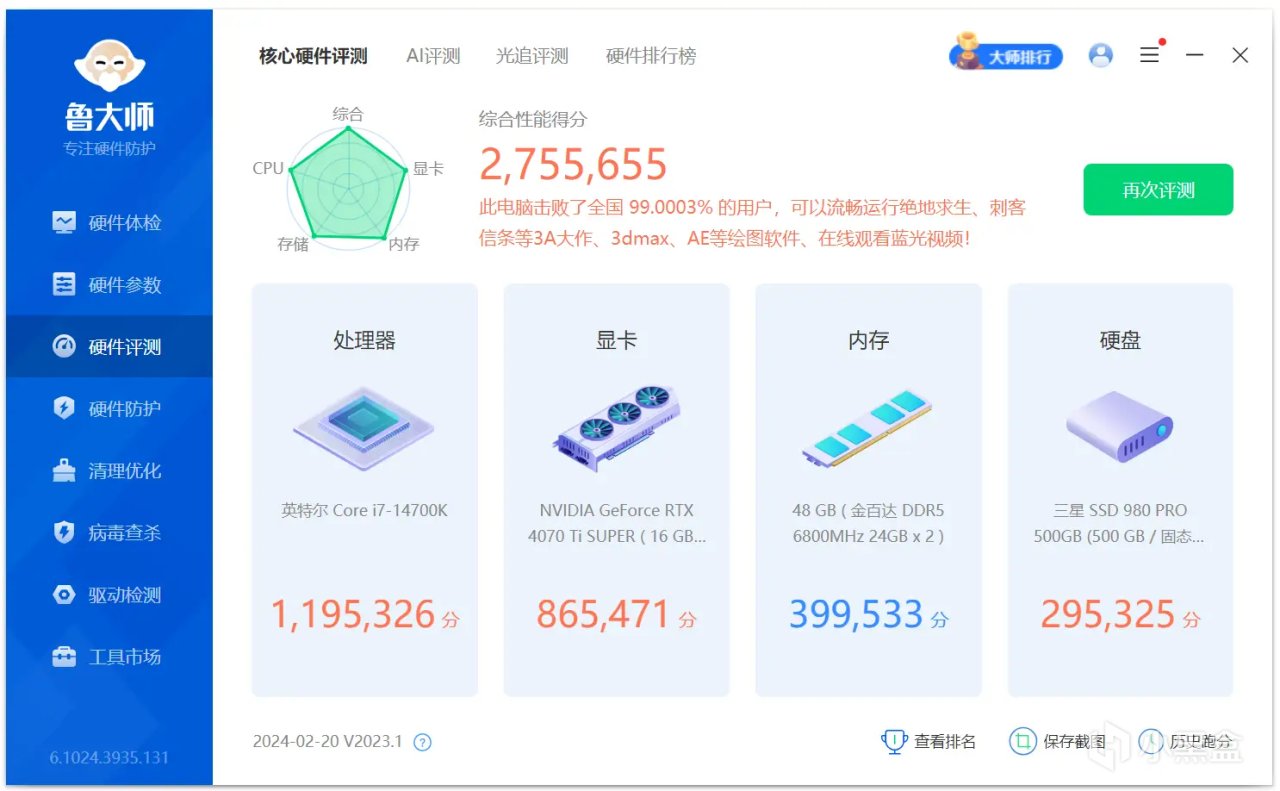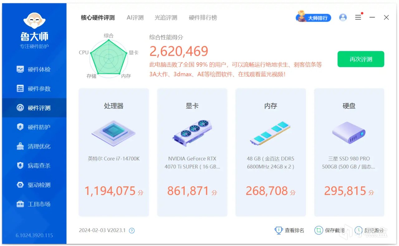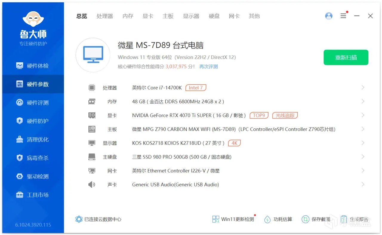 显卡方面我用的是影驰RTX4070 Ti SUPER星曜OC,该显卡的核心是基于AD103核心打造,内部搭载的CUDA核心达到了8448个 ,显存位宽也比RTX 4070 Ti的192bit提升到了256bit,显存规格更是达到了16GB GDDR6X,性能方面可圈可点。