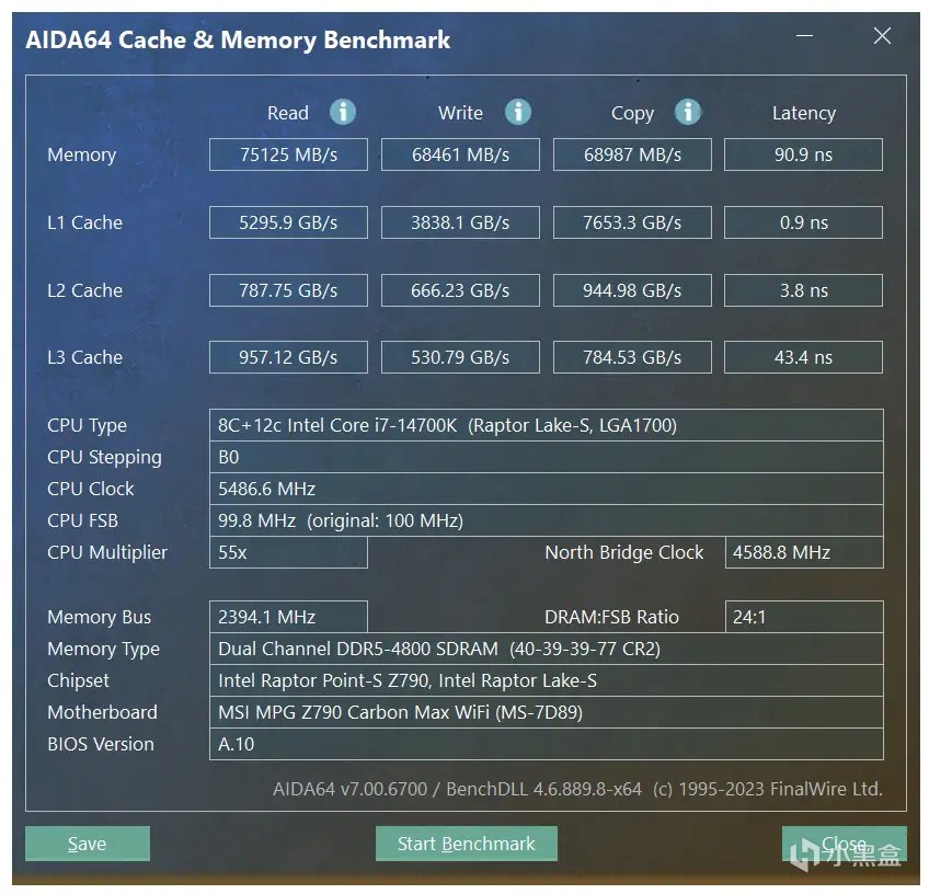 未开启XMP,默认频率为4800MHz,通过AIDA64(V7.0 6700)实测: