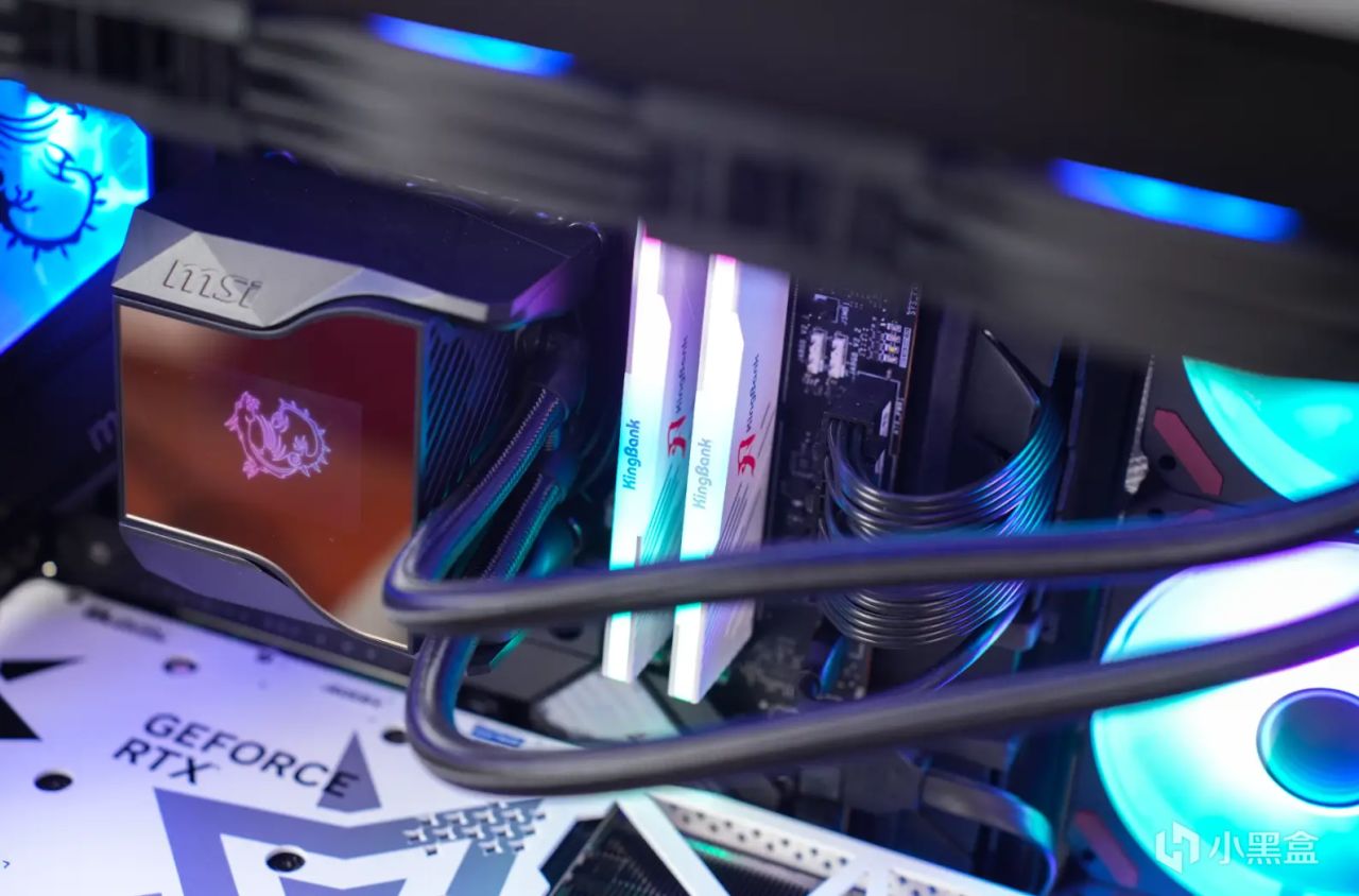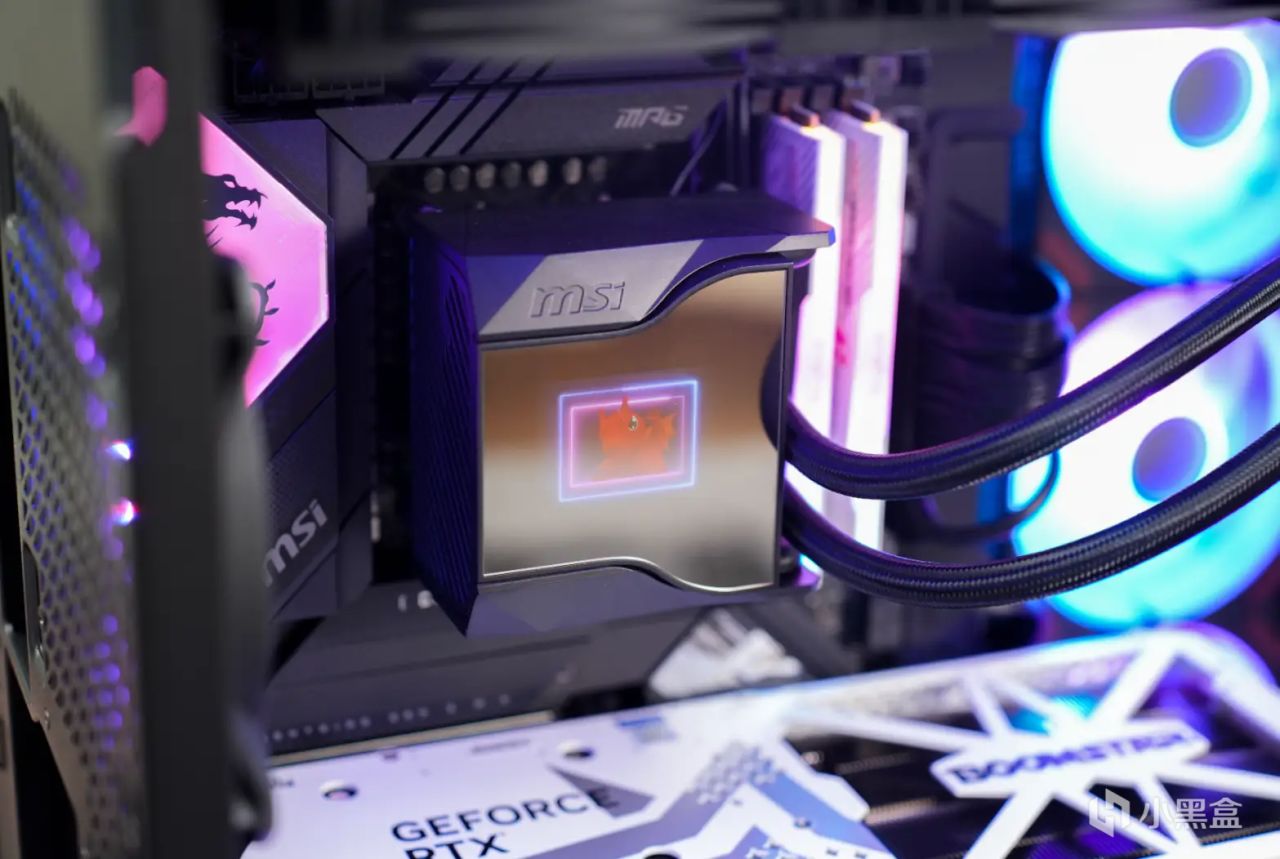 散热器用的是最新的微星MPG CORELIQUID D360,该散热器可以算是微星之前旗舰级S360水冷的兄(ping)弟(min)版,主要是价格低了不少,但风扇还增加了ARGB灯效;同时水冷头的一系列亮点也保留下来,内部搭载了一个60mm的下压风扇以及一块2.4 英寸IPS面板屏幕,不但可以显示本机CPU 温度、水泵风扇转速等一系列信息,还可以通过MSI CENTER软件自定义图片、视频等内容,带来更个性化的视觉效果。