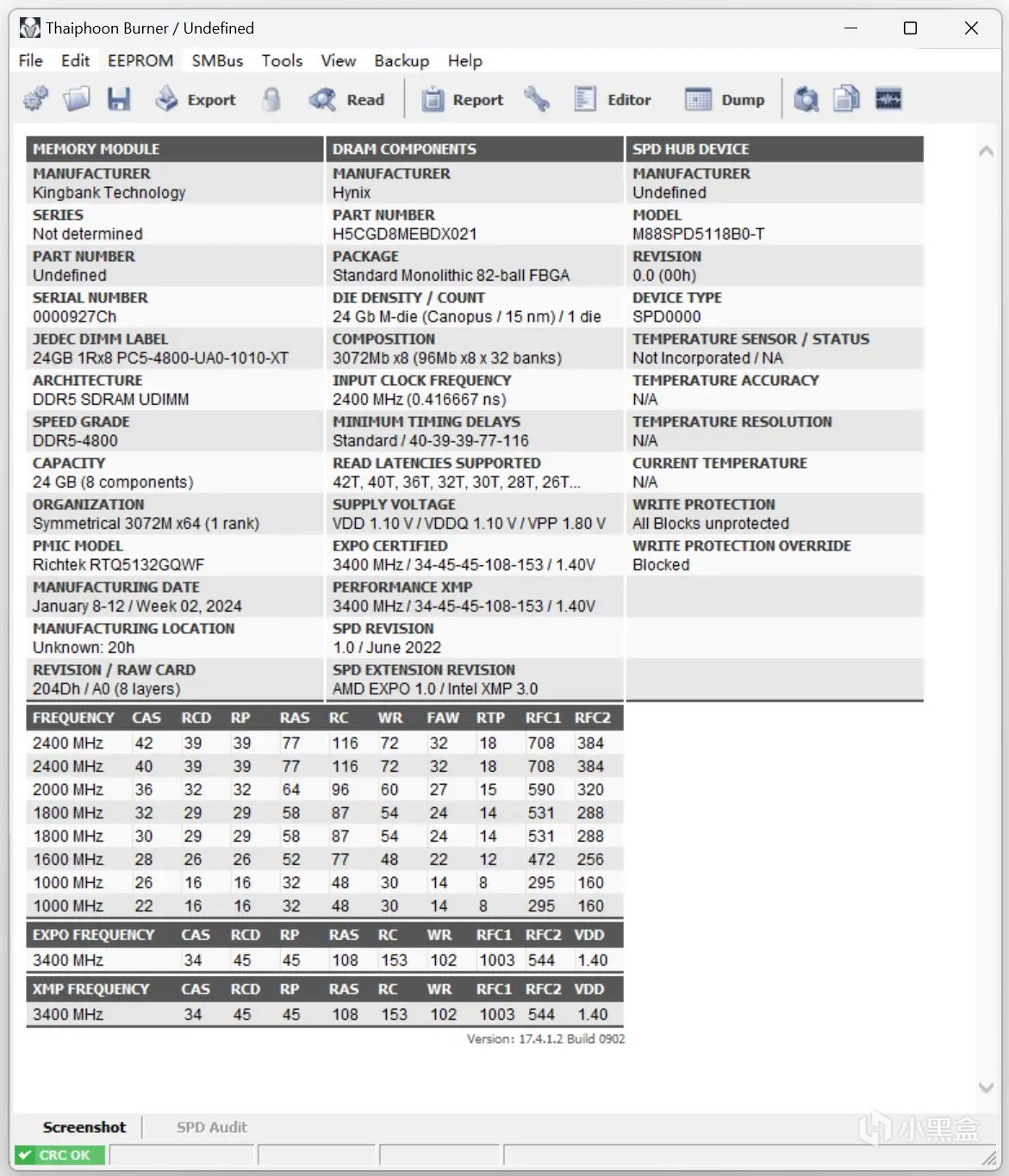 上文也说了,金百达白刃DDR5 24GB*2 6800MHz套条采用的是海力士新一代的M-Die颗粒,通过台风软件不难看出,新一代的M-Die颗粒编号为H5CGD8MEBDX021,单颗容量为3GB,8颗可组成24GB单条容量。