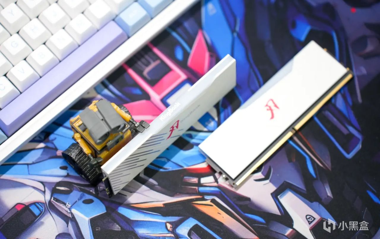 该内存使用了纯白色的金属散热马甲,散热马甲非常厚实,内部还采用了工业级的导热硅脂。同时,在外观上最吸睛的是散热马甲的中间印有红色的“刃”以及金百达的Logo,结合周边附上一些银色的线条点缀,辨识度直接拉满。