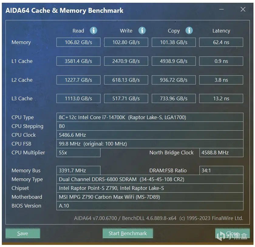 开启XMP后,内存频率为6800MHz,通过AIDA64(V7.0 6700)实测: