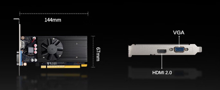 显卡拥有1024 MUSA核心,核心频率1.3Ghz,4GB显存,128bit位宽,功耗为40W,内置HDMI 2.0和VGA接口。