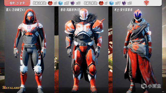 • 目前的詭計護甲外觀池爲年1的熔爐護甲:術士“安卡探索者IV”、獵人“萬劍破空4.1”、泰坦“鳳凰紛爭0型”