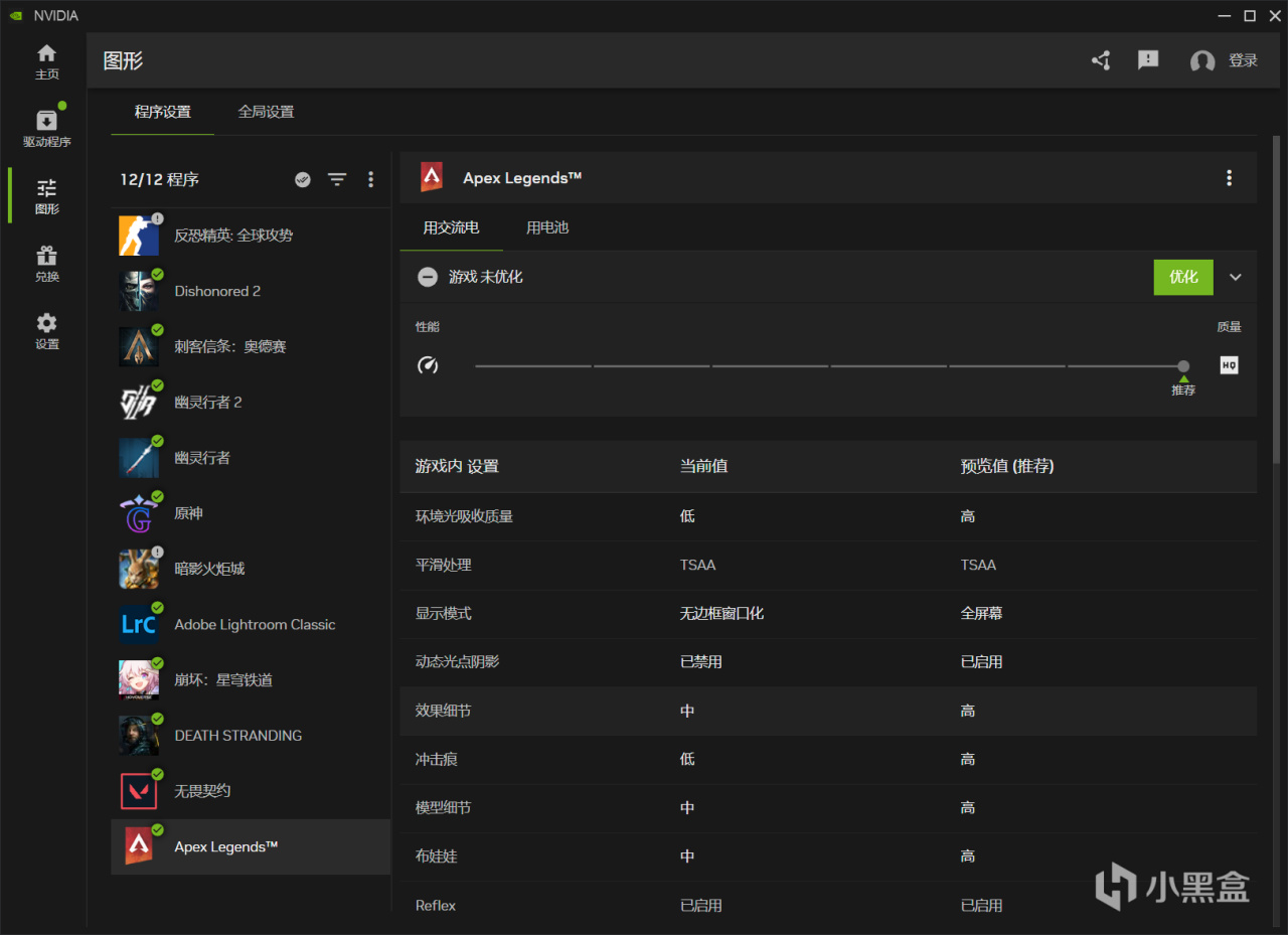 GeForce Experience读取游戏画面设置的功能也都在,会有当前画质设置(当前值)和推荐设置(预览值)