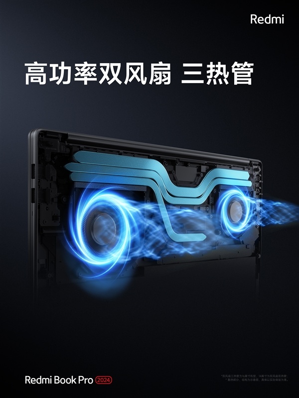 散热方面,Redmi Book Pro 16 2024搭配强劲飓风散热,性能释放能够到达惊人的70W。其内置三热管强劲飓风散热,8mm+6mm+6mm覆盖主要核心器件,迅速将热量分散。