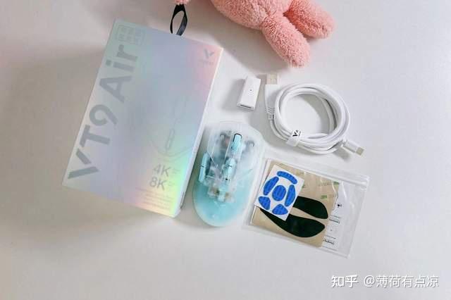 Air的外观设计延续了VT9系列的造型,共设计有5种颜色,主打的是墨隐和极光配色,机身采用了半透明设计,我手里的这款极光采用白色半透搭配浅蓝配色,看起来十分清新。鼠标的总量仅60g,三围大小为120*65.7*37.5mm,比较适合中小手。整体的材料采用防打油、半透磨砂细纹外壳,手感柔软舒适,不易粘指纹,同时也更耐磨耐用。