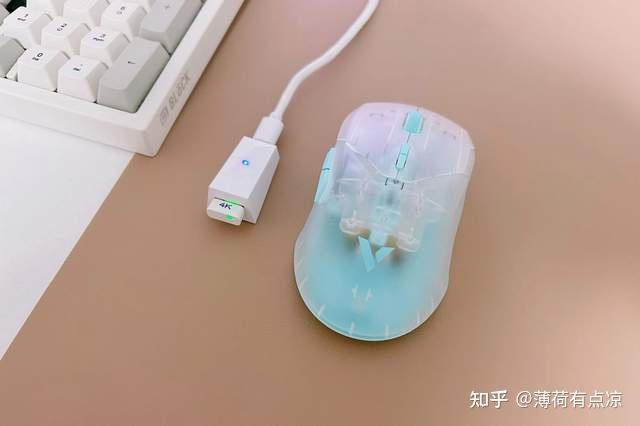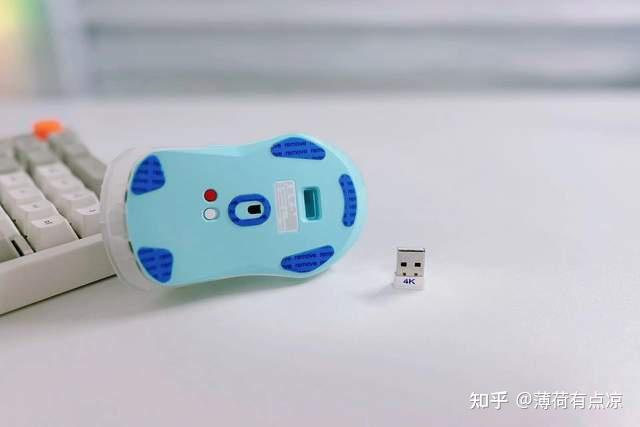 鼠标配备Nano 4K接收器,体积小巧,不过值得一提的是这么小的体积下还预留了LED提示灯,通过灯光颜色可以实时看到电量及连接状态,在与鼠标连接后可以根据剩余电量仪绿色(80-100%)、黄色(60-80%)、橙色(40-60%)、红色(20%以下),方便实时查看电量。鼠标整体细节处理的非常精致。