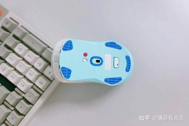 鼠标背面四周都有特氟龙脚垫,前二后三分区设计可确保鼠标在快速移动中保持稳定和顺滑。出厂时还贴有防划贴。传感器位于中心,上方是电源开关和自定义按钮。下方是磁吸式无线接收器收纳仓,仓口斜面处理,方面取用,设计巧妙。