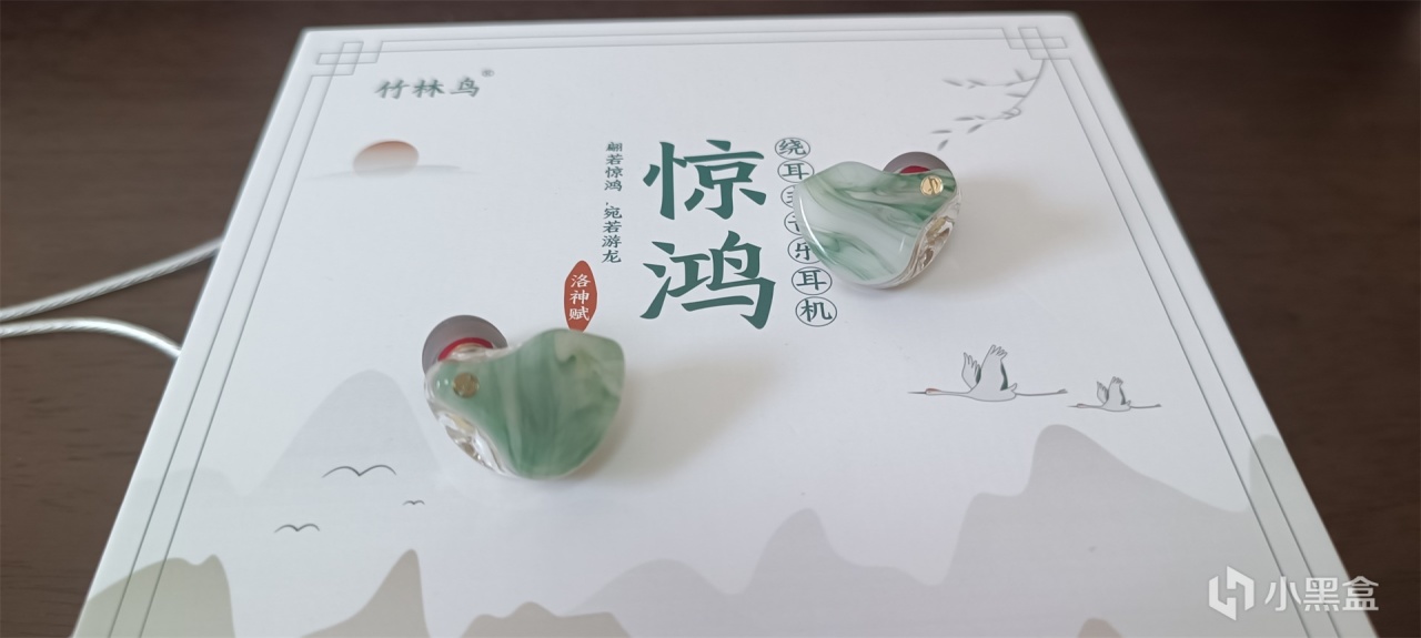 驚鴻的包裝盒採用了一個正方形的簡約設計,背景是一副簡潔的山水圖,正面印有竹林鳥和驚鴻的大幅標示以及簡單的耳機定位。