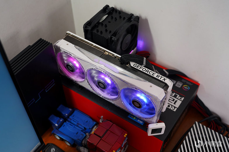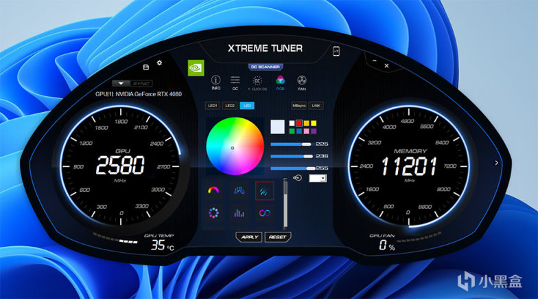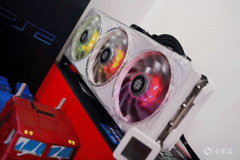 首先展示下显卡的 RGB 灯光性能,加成还是蛮足的! 另可通过附带的灯光同步线,支持到各大主板厂商的 5V ARGB 灯光同步,影驰自家软件控制的话,则无需线材的连接,不过讲真!个人真心还是比较喜欢它不亮时候的样子,不亮会显得低调且和谐一些,不过实际上机侧看的话,应该也还好,真不行也可以关灯。