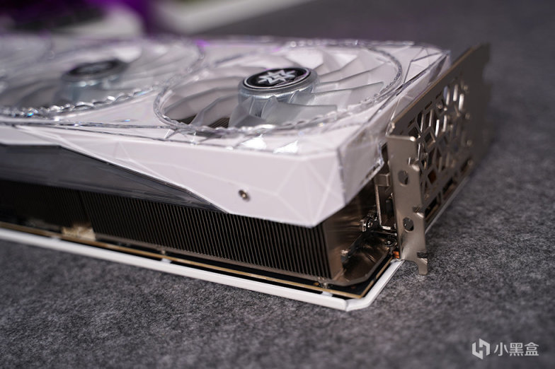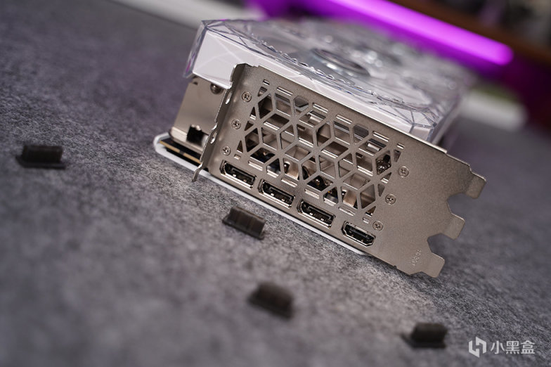 采用 3 PCI 挡板设计,实际整体厚度约为 3.2 个 PCI 卡槽位,表面镀镍处理,大面积几何开孔,用于增强进出风,对应给到的接口,分别为 3 个 DP 1.4a 接口及 1 个 HDMI 2.1 接口。