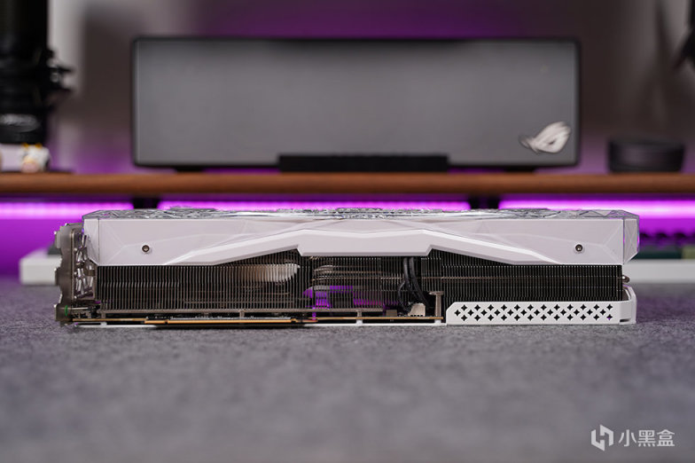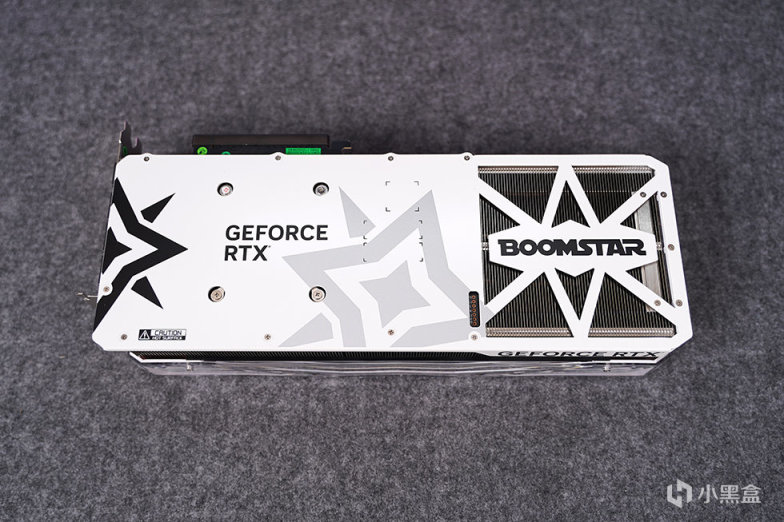 金属背板一改 30 系黑色的设定,遵循纯白美学,这代采用白色设计,表面 GEFORCE RTX 星曜 LOGO 修饰,白色喷涂 LOGO 丝印处理,尾部大面积散热开孔亦是星曜的图案样式。