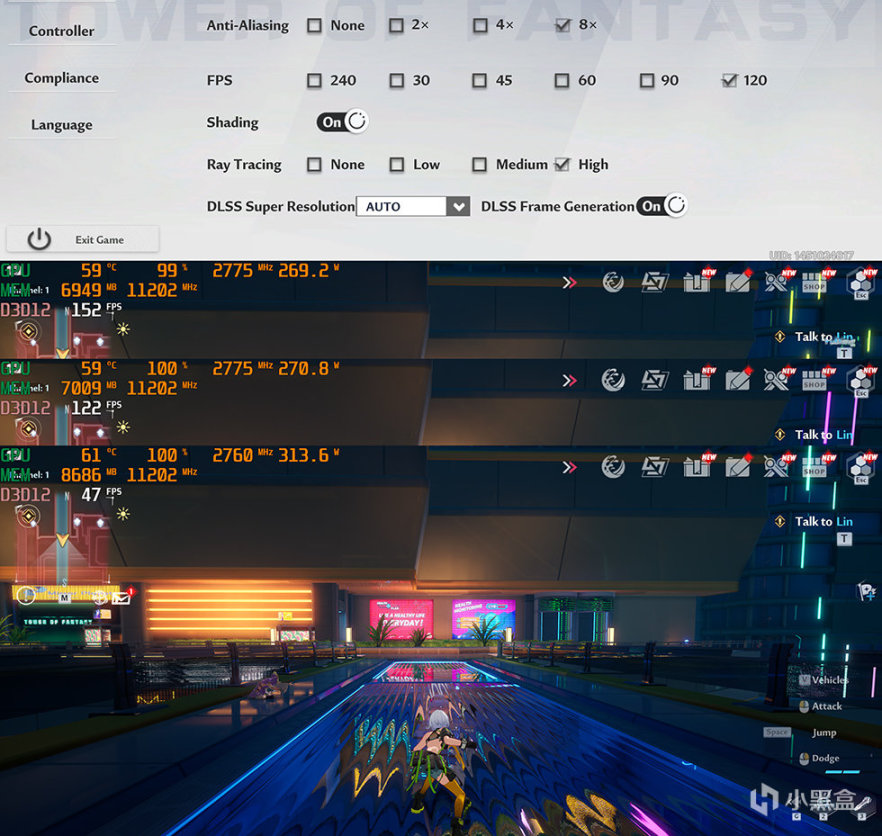 Tower of Fantasy,,画质均拉到最高选项,4K分辨率,统一的场景下,开启 DLSS 3 帧生成 152FPS,常规 DLSS 122FPS ,无 DLSS 47FPS。