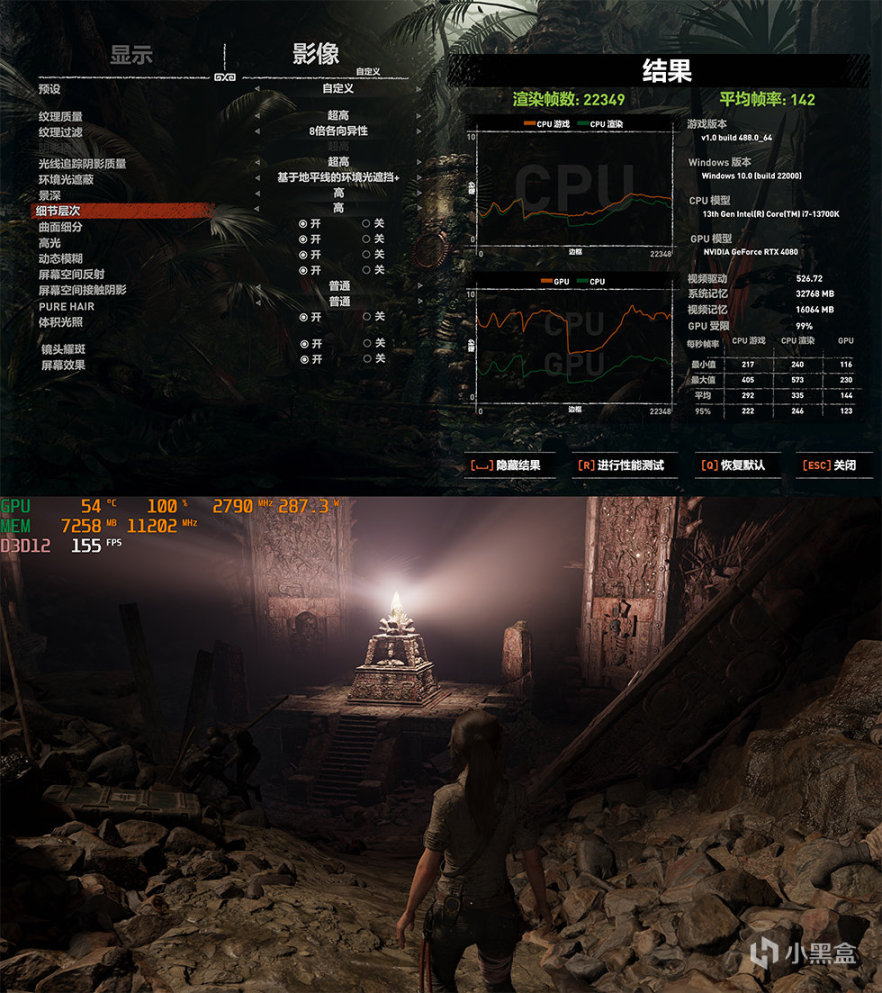 古墓丽影:暗影,4K 分辨率,自动 DLSS,最高画质,超高光追,平均帧数为 142FPS。
