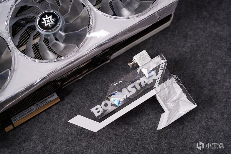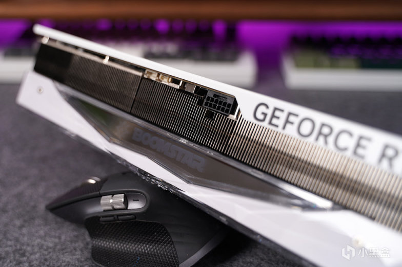 白色居中位置带有一道银灰色镜面修饰,内带有星曜 BOOMSTAR 的文字 LOGO 组合,通电后亮起 ARGB 灯效。单 PCIe 5.0 规范的 12VHPWR 供电接口,对标显卡 TDP 320W (MAX 450W),RTX 4080 星曜采用的是 18+3 相供电配置,超越公的配置。