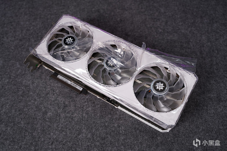 拆开保鲜袋子,里头显卡外壳出厂还包裹了一层塑料膜。尺寸依旧好大一块,官标 352 × 153 × 69mm(含挡板),338 × 139 × 69mm(不含挡板),重量同样感人。