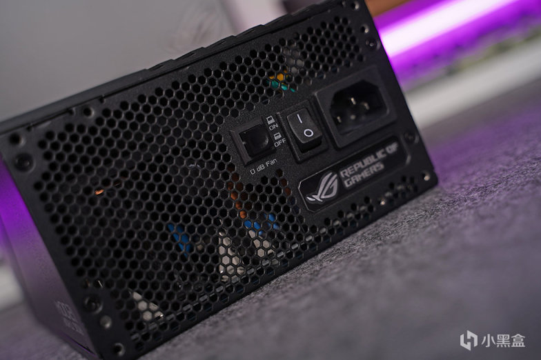 电源尾部,给到大面积开孔出风,带有 AC 开关,另搭配有一个 HYBRID MODE 风扇停转模式切换按钮,默认按压为正常运行,松开则可以实现 50% 负载下风扇停转运行,从而实现零噪音的使用体验。