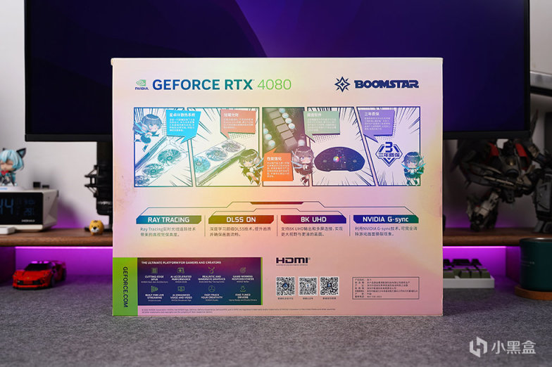 首先看看外包装,外包装有着淡淡的炫彩处理,正面星曜娘二次元人物辅助装饰示意,上沿影驰标志和三年质保及个人送保二维码图标,下沿 NV GEFOCE RTX 4080 图标,标注 16GB GDDR6X 显存,DLSS / RAY TRACING / REFLEX / STUDIO 技术应用。包装背面,图文罗列显卡的各种规格技术应用等信息、官方二维码及厂家联系信息。