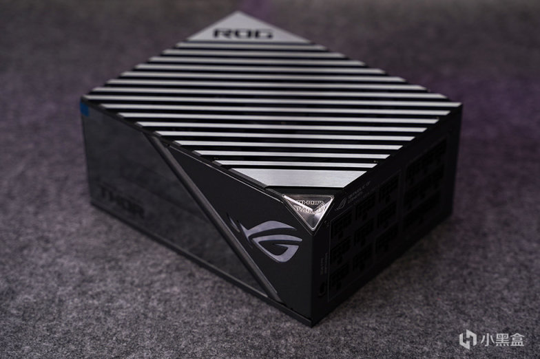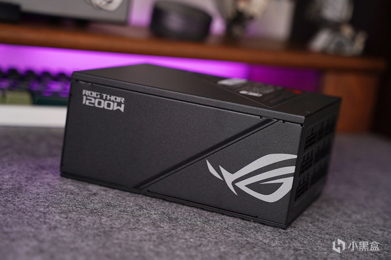 另一个侧面则为常规的磨砂颗粒面工艺,左上角 ROG THOR 1200W 标注,右边败家眼,延续切割的视觉元素,切割线条采用凹面处理。
