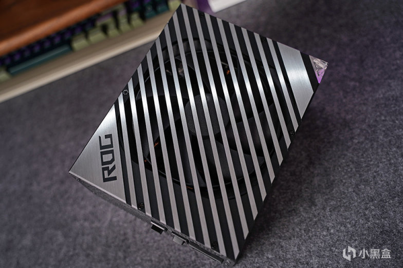 造型斜面切割线条格栅样式,辅以 ROG 字体标志示意,表面拉丝面处理,质感及科技感满满!对应内部配置的是一把 135mm 双滚珠轴承的轴流风扇,有着更好的散热及静音表现,且支持风扇启停技术( 负荷低于 50%,可选择开启风扇停转,亦或根据不同负载智能调速 )。