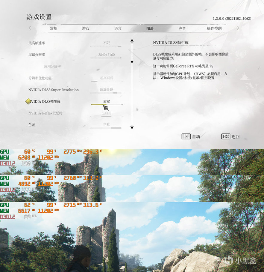 A Plague Tale: Requiem (瘟疫传说:安魂曲),画质均拉到最高选项,4K分辨率,统一的场景下,开启 DLSS 3 帧生成 190FPS,常规 DLSS 133FPS ,无 DLSS 69FPS。