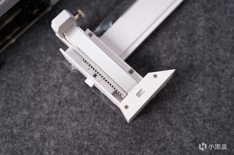 附带显卡支架,外观设计对应显卡本体,有着统一的设计语言,背面调节限位处为金属件,保证支撑强度,另给带有 ARGB 接口,实现光效的一体联动。