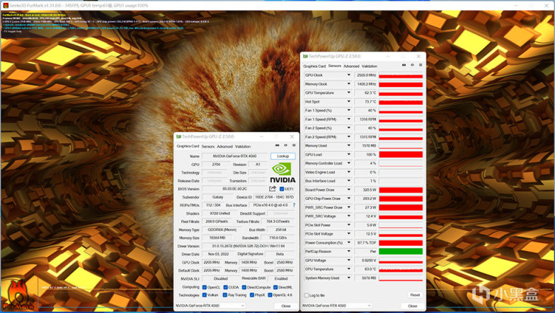 FURMARK 满载测试,过程 20 分钟左右,影驰 RTX 4080 16GB 星曜 OC,GPU 频率 2580MHz 上下,显存维持 1400MHz ,核心温度 62.3 度(结温 73.7 度),显示功耗 320.5W 左右。