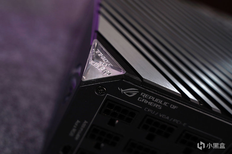 电源的正侧面辅以镜面切割装饰与划分,内居中位 OLED 功耗显示屏,下角 REPUBLIC OF GAMERS 及 THOR 字体标志点缀,右斜面切割的线条及败家眼则带有灯光( AURA RGB 灯光同步)。
