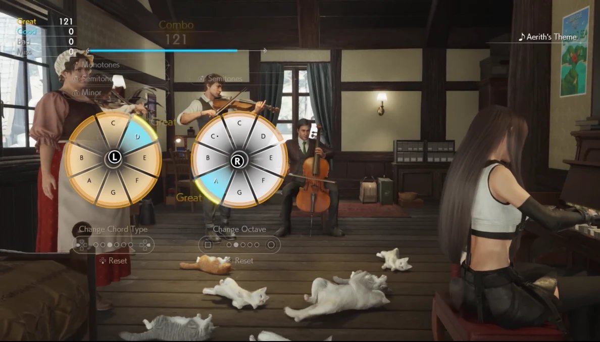 與之相反的則是本作的音樂表現,可以說是十分驚豔,曲目數量極爲豐富,風格和類型十分靈活多變,它們與遊戲的適配性極強,能夠極大程度地調動情緒。在和莫古力做遊戲時,輕鬆歡快的音樂讓所有煩惱都煙消雲散;在長途跋涉時,一首童聲演唱的小曲讓枯燥的趕路變得愜意。一些經典曲目的改編也不容小覷,搞怪詼諧的陸行鳥之歌,也能變得充滿力量和速度感,反派登場的BGM也更具有壓迫感,本作也適配了PS5手柄的各項機能,甚至還利用上了動態感測,覆蓋了劇情、駕駛、戰鬥、小遊戲等各方面,整體體驗良好。不過在部分劇情裏,爲體現手柄特性,橋段設計顯得有點拖沓、詭異,但這種情況並不算太多。