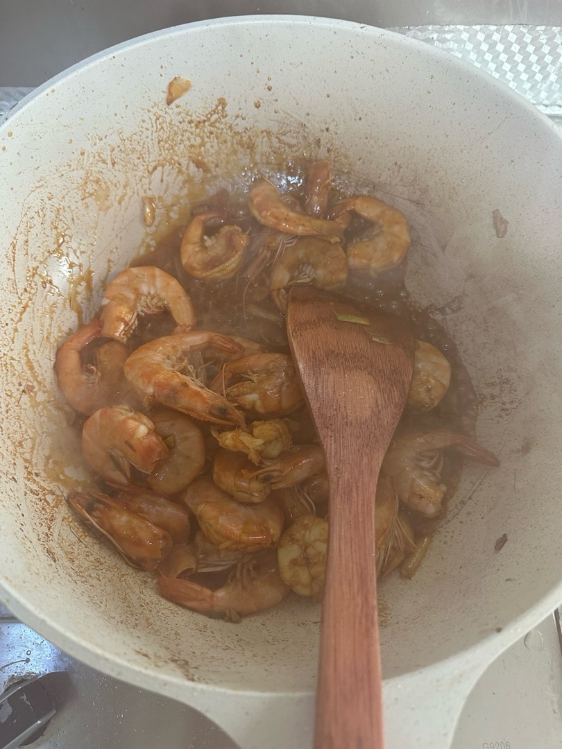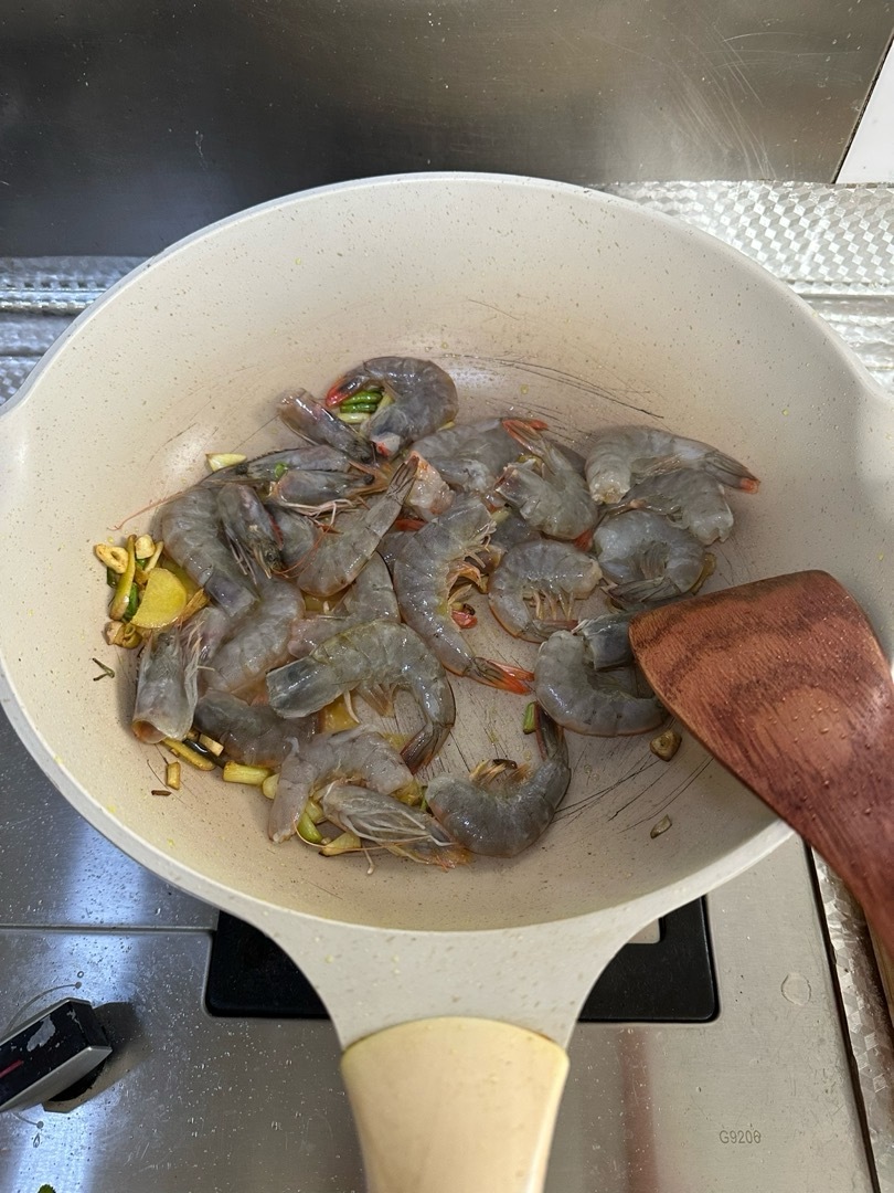 2.倒入虾,炒到变色,加入料酒,继续翻炒