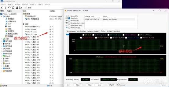 接下來是CPU 單烤測試,AIDA64 FPU單烤17min,在默頻狀態下,3392MHZ的頻率沒有絲毫降低,最高溫度也只到86°C,控溫甚至比筆者240水冷的下的CPU還好。再一次說明ROG這套模具散熱能力的強悍之處。