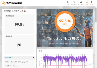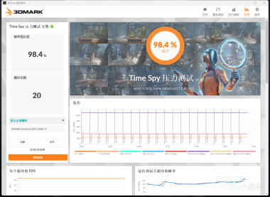 在玩遊戲過程中,筆者也很看重機器散熱以及硬件持續的表現力,3DMark壓力測試就是模擬了大多數的遊戲場景,數量龐大的多面體使得GPU滿負載,20輪benchmark也能體現GPU的散熱能力,也是GPU體質的測試方法之一。當然在筆記本中,筆者認爲成績的好壞更多地取決於廠家對於模具的設計和散熱的考量。