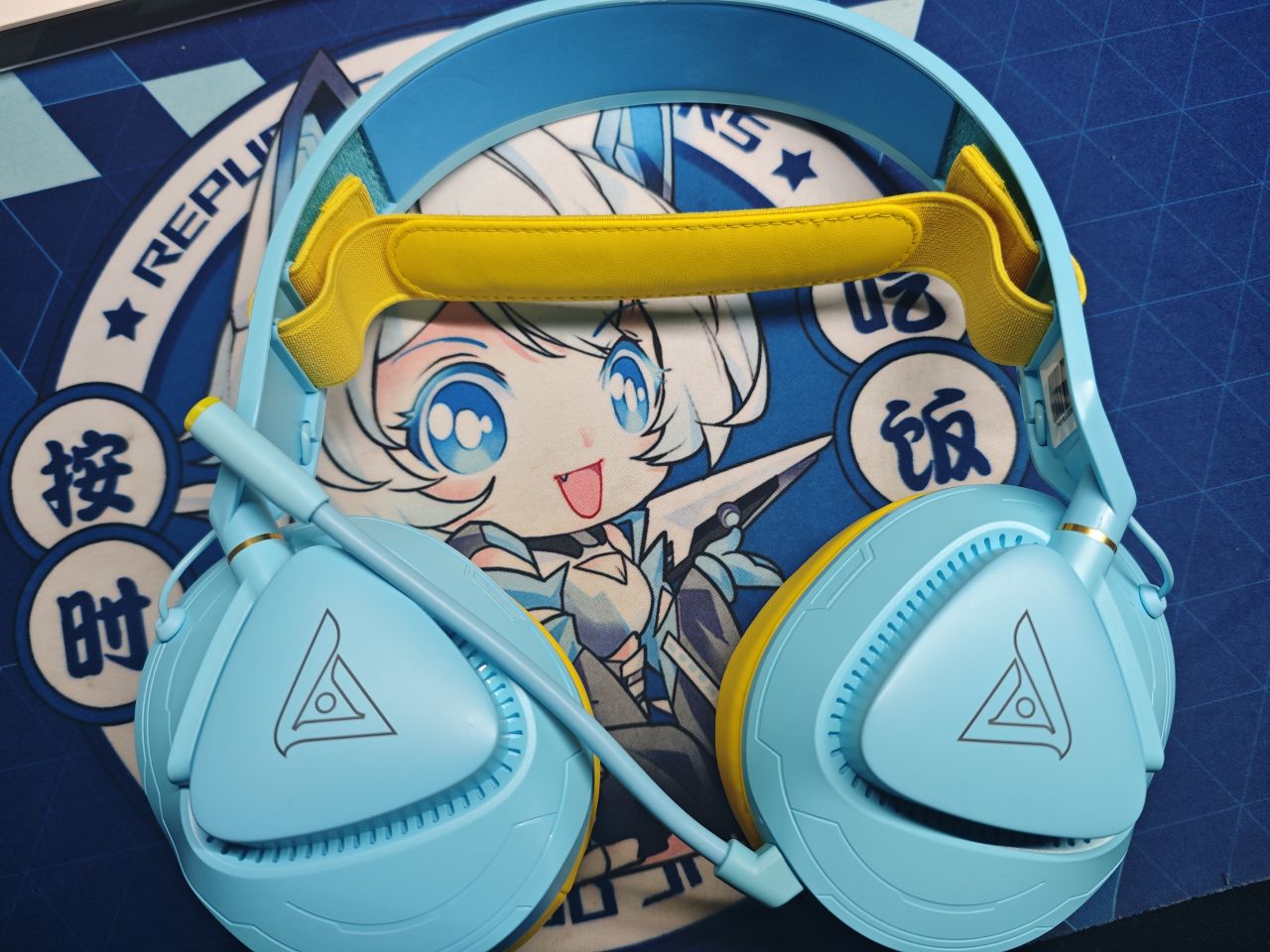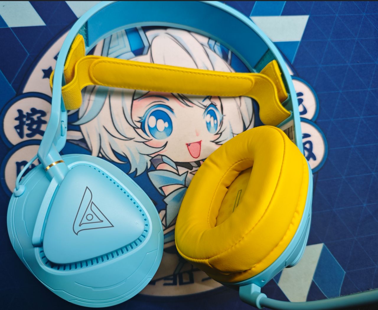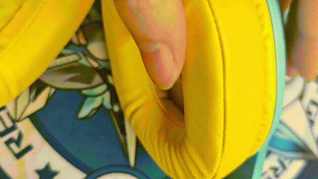 整個耳機的外殼是藍色,像是海藍色一樣,跟海之鹽這個飲料有點像,好久沒喝了。耳罩和緩衝帶是黃色的,藍色和黃色搭配在一起感覺還挺合適的。耳機的重量爲228g(不含長麥、配件),十分輕量化設計。