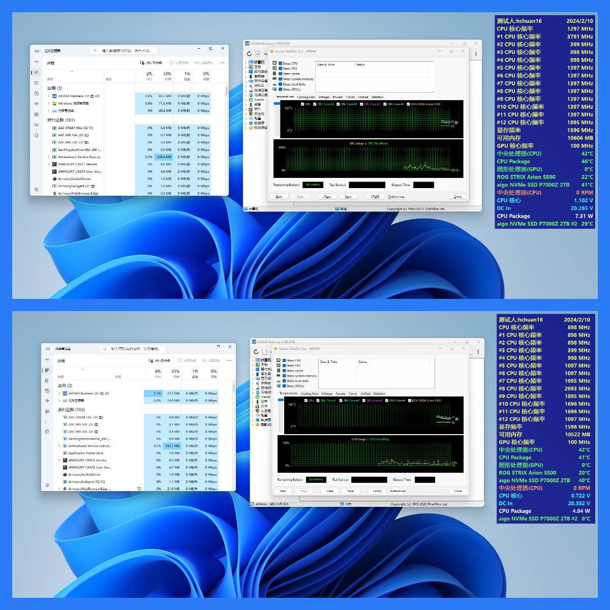 如果平时使用待机比较多,亦或者准备长期不关机,完全可以使用这套配置降低功耗和运行温度,测试时室温13°,AIDA64待机数据对比参照下图: