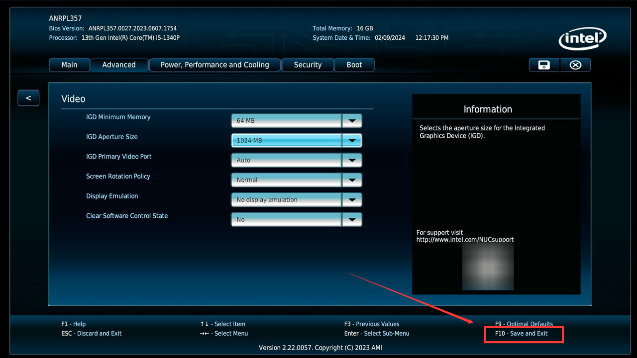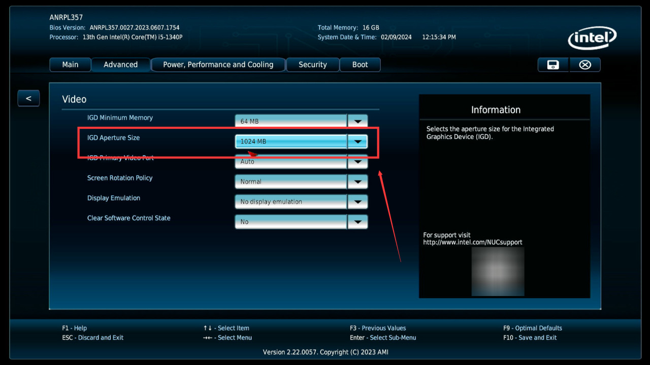 进入二级页面后点击IGD Aperture Size,修改为1024MB,也就是最大显存调整为1G,i5-1340P版本最大只能改这么大。
