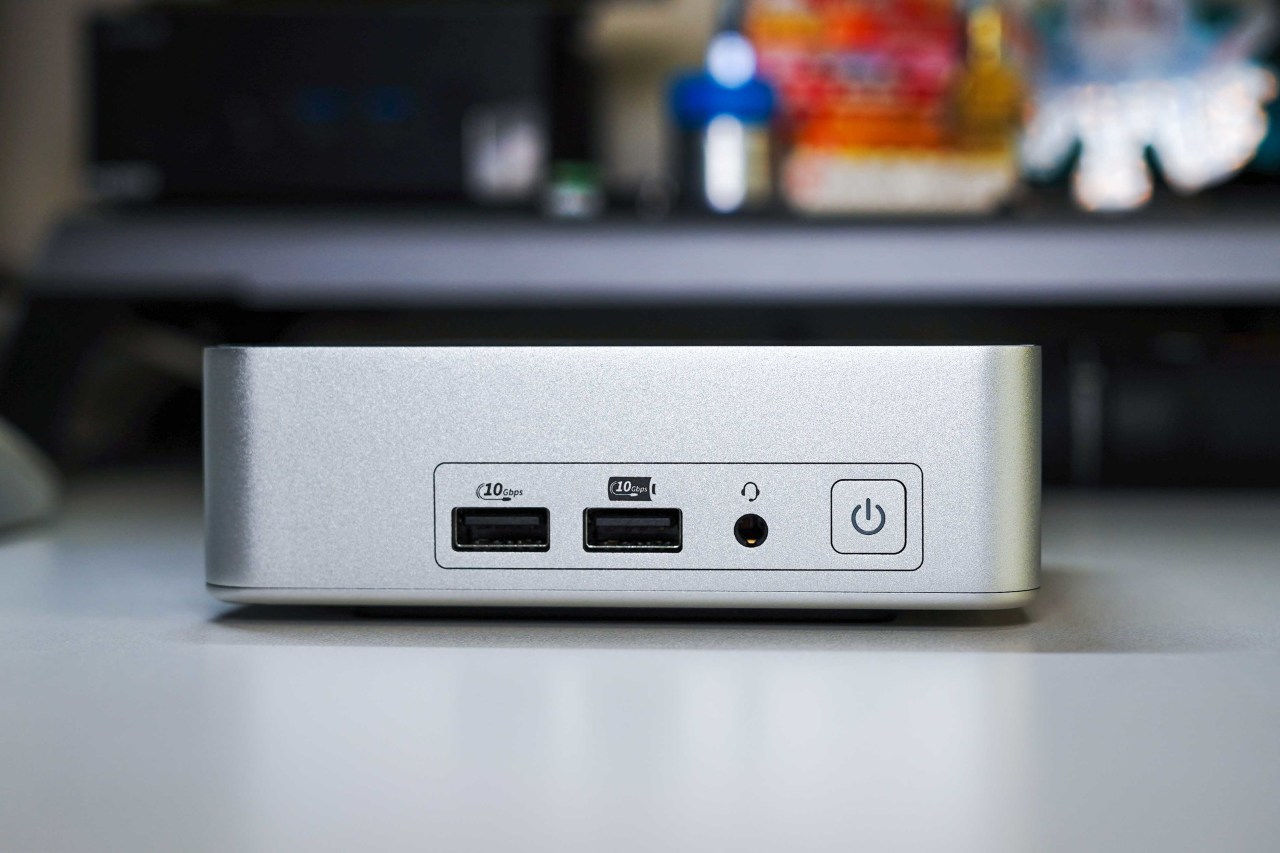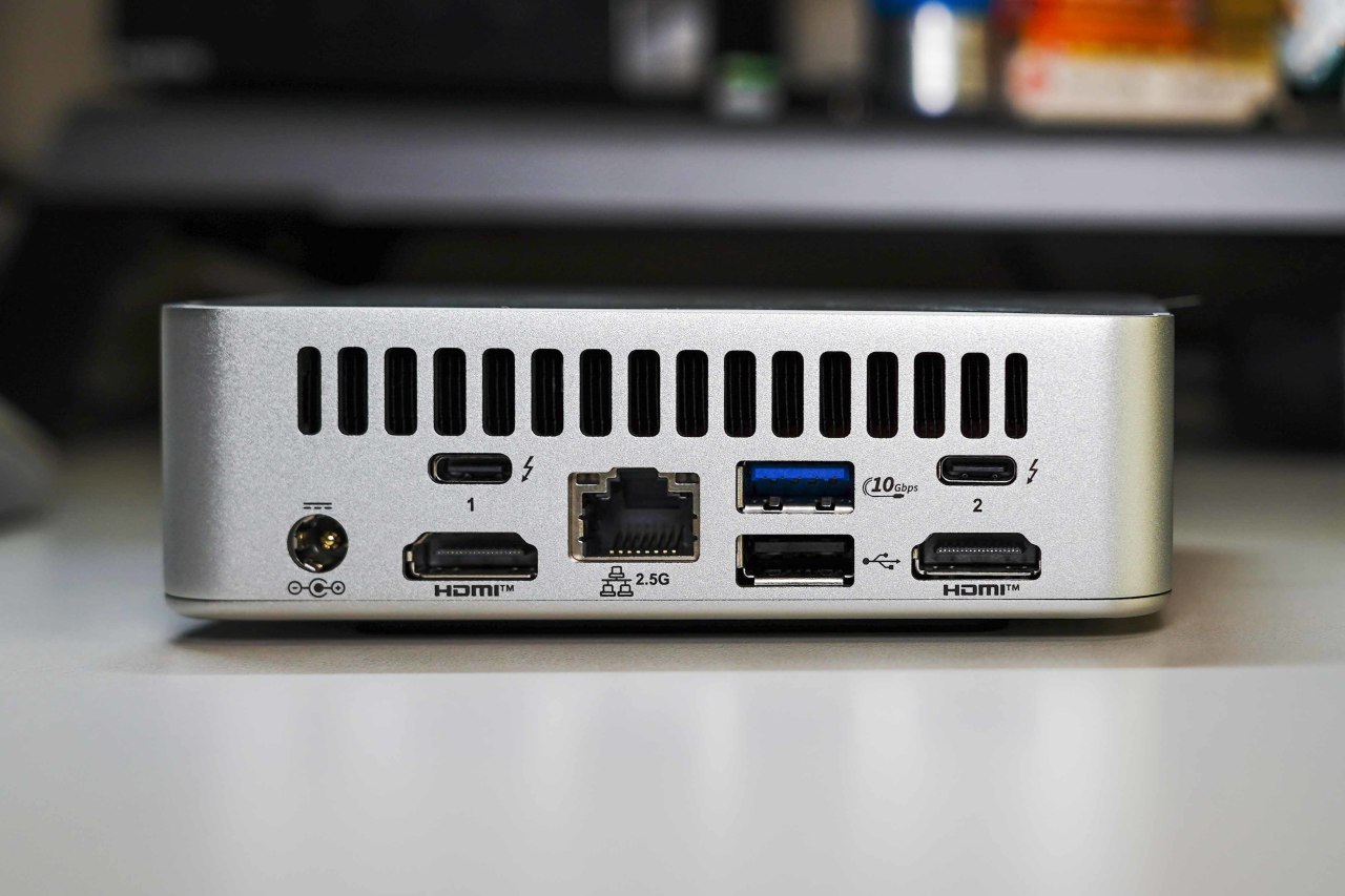 不经常拔插的接口都在机身背部,包含雷电4协议Type-C接口*2、USB3.2Gen2接口*1、USB2.0接口*1、HDMI2.1接口*2、2.5G网口*1以及DC供电接口。