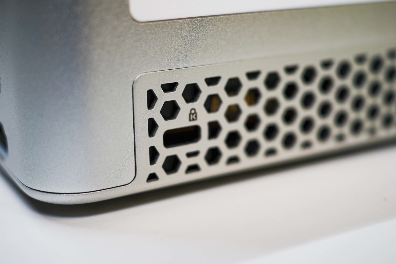 Kensington锁孔位设计在左侧的尾部,视觉上和散热孔基本融为一体,完全没有突兀感,安装锁具后也不会过于突兀。