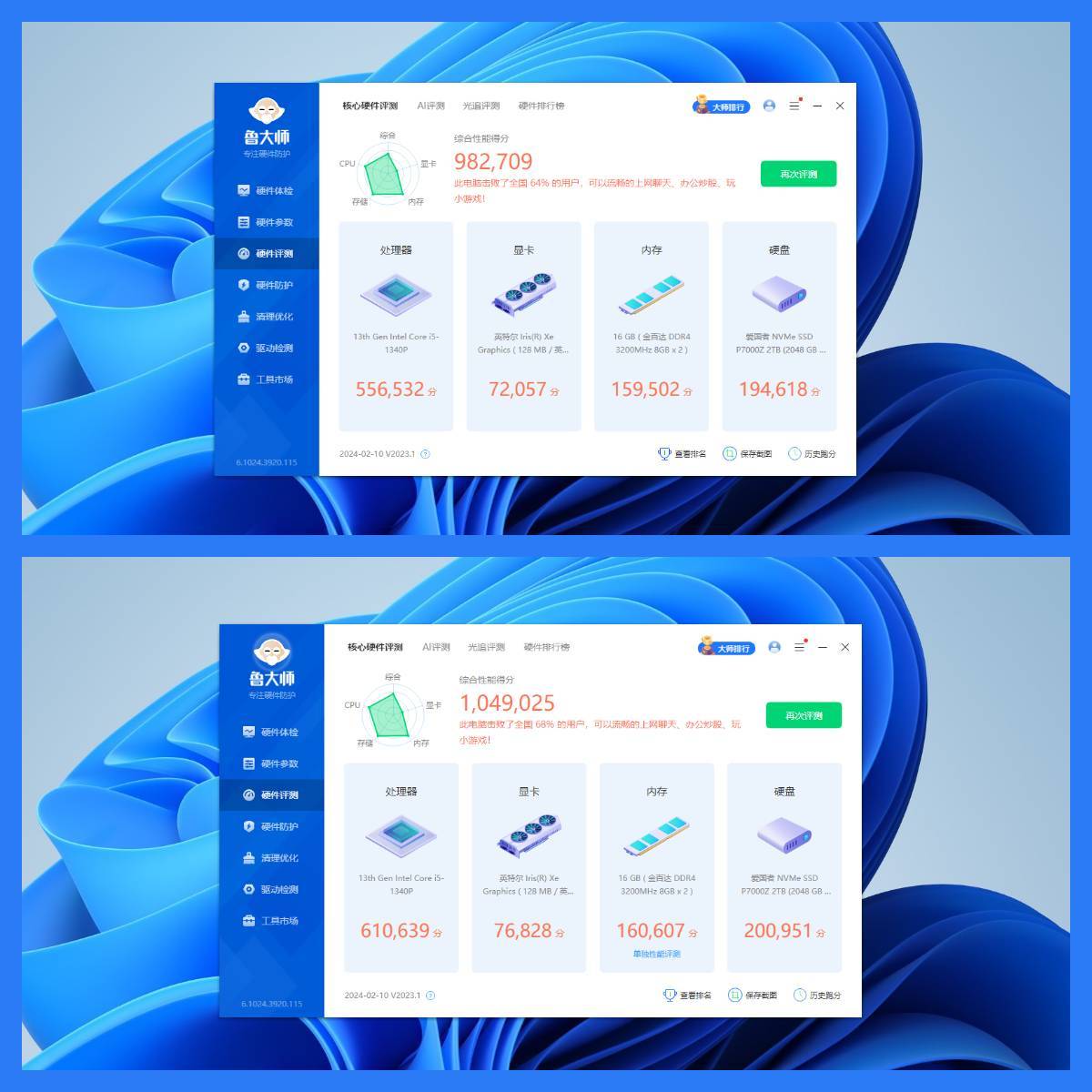 ●调试前综合得分为982709 / 调试后综合得分为1049025