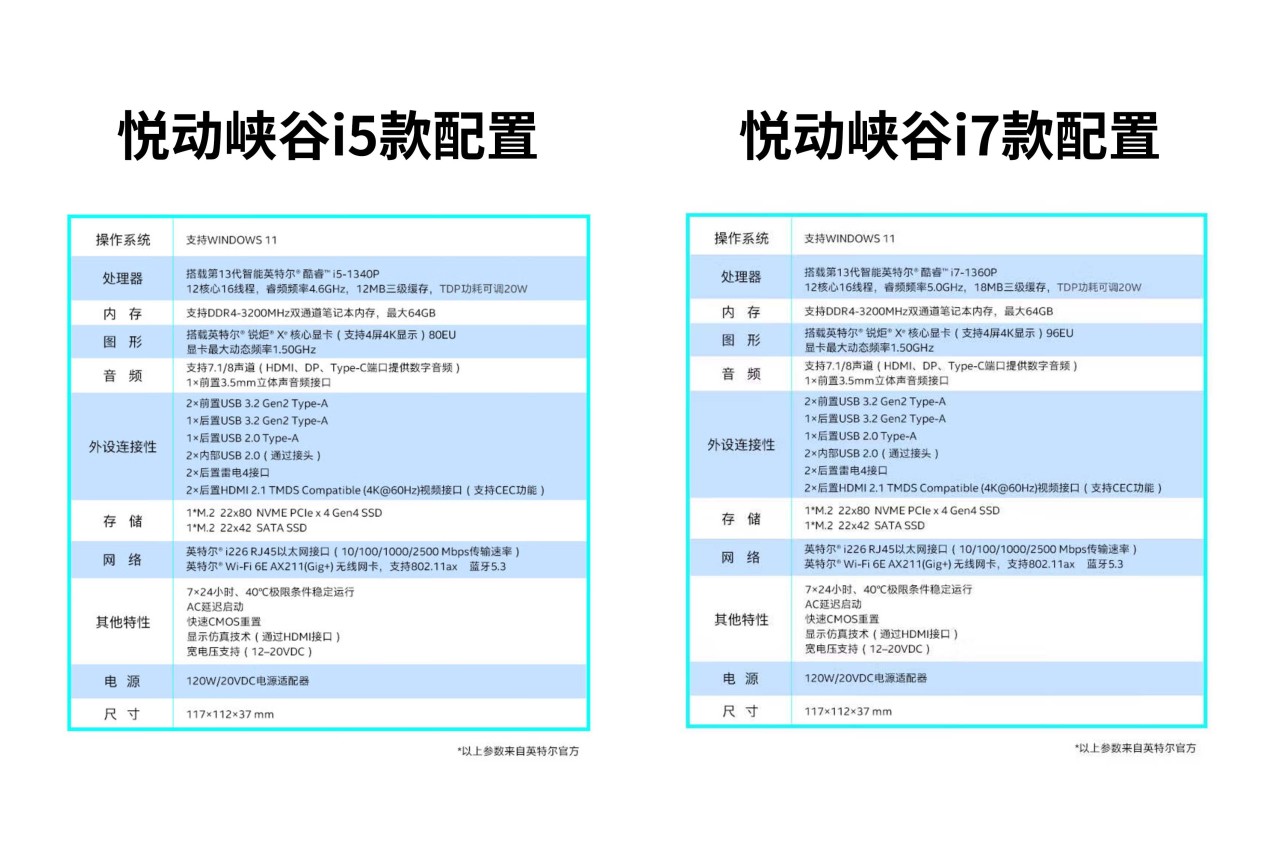 在售的最新一代NUC还是以13代为核心平台,Ultra平台估计得等Q2或者Q3了,简单说一下市售版本的悦动峡谷配置信息:
