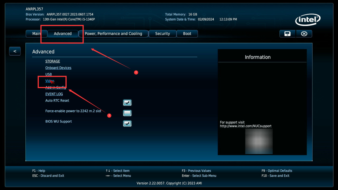 悦动峡谷默认的核心显卡配置比较保守,需要手动改一下,进入BIOS后跟着下图所示,依次点击Advance中的Video选项。