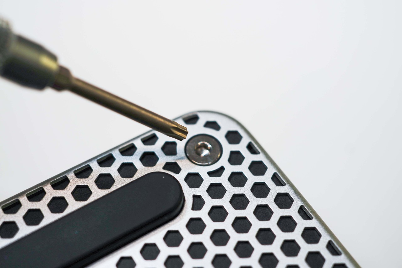 悦动峡谷的拆机比较简单,卸掉底部四角上的固定螺丝即可,螺口为六角,原包附赠了对应的简易螺丝刀,不用担心没批头拆不了。