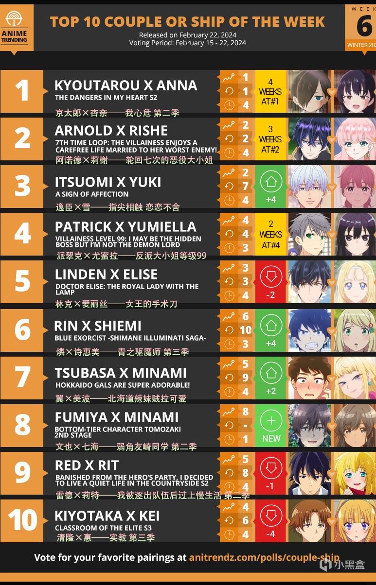 结合新番播出情况,特别在周二篇中加入外网知名网站的各类投票排行结果,方便大家对当前番剧进行讨论对比。