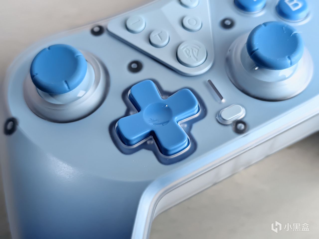 十字鍵部分採用的是標準的導電膠設計,手感比較適中,但偏向硬朗的風格,中間的功能鍵爲鍋仔片設計,手感還算不錯,不過順帶一提,說明書要好好看,因爲很多東西都要通過說明書才能知道,例如XBOX和NS的協議切換,就需要用到+ -的組合鍵,不過好在不算複雜,沒有什麼1234的設定。