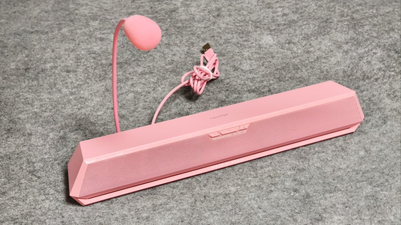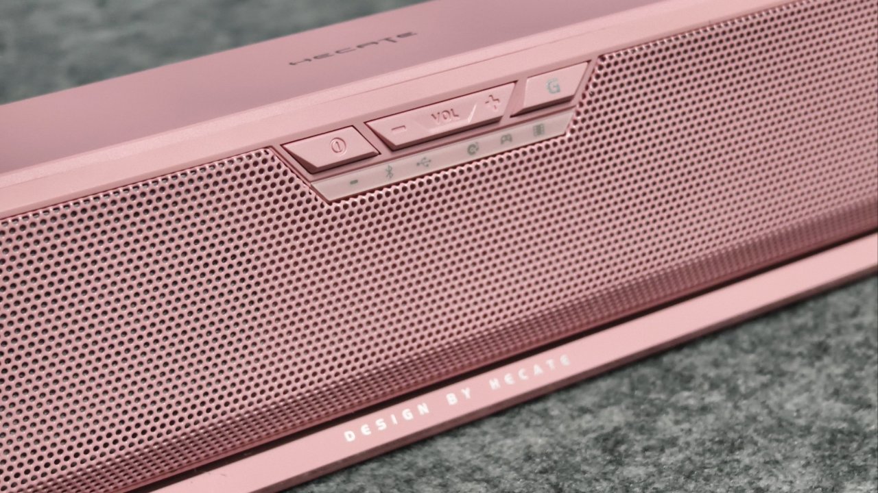 那么我们再看看音箱的正面吧!给他一个特写。正面看起来虽然十分粉嫩,但它其实是一个个很牢固的铁网构成,所以你也不用担心平日里磕到之类的。