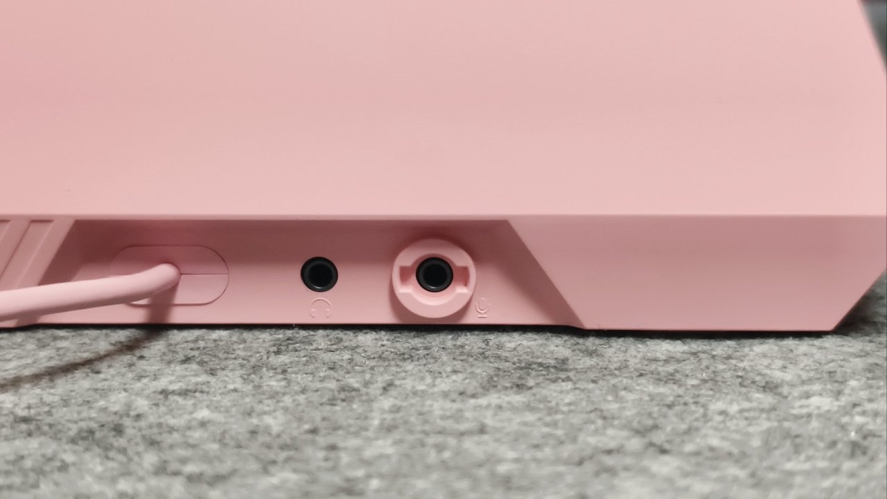 那么他的后面除了麦克风接口还有个3.5mm耳机接口,这个玩意就有点好玩了。将耳机插入之后,你的耳机会得到一个BUFF,直接自带一个DSP声卡,也可以在游戏中享受7.1环绕音效,适配性很不错。