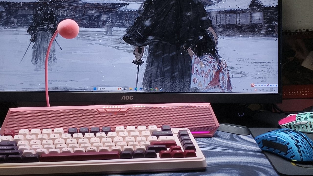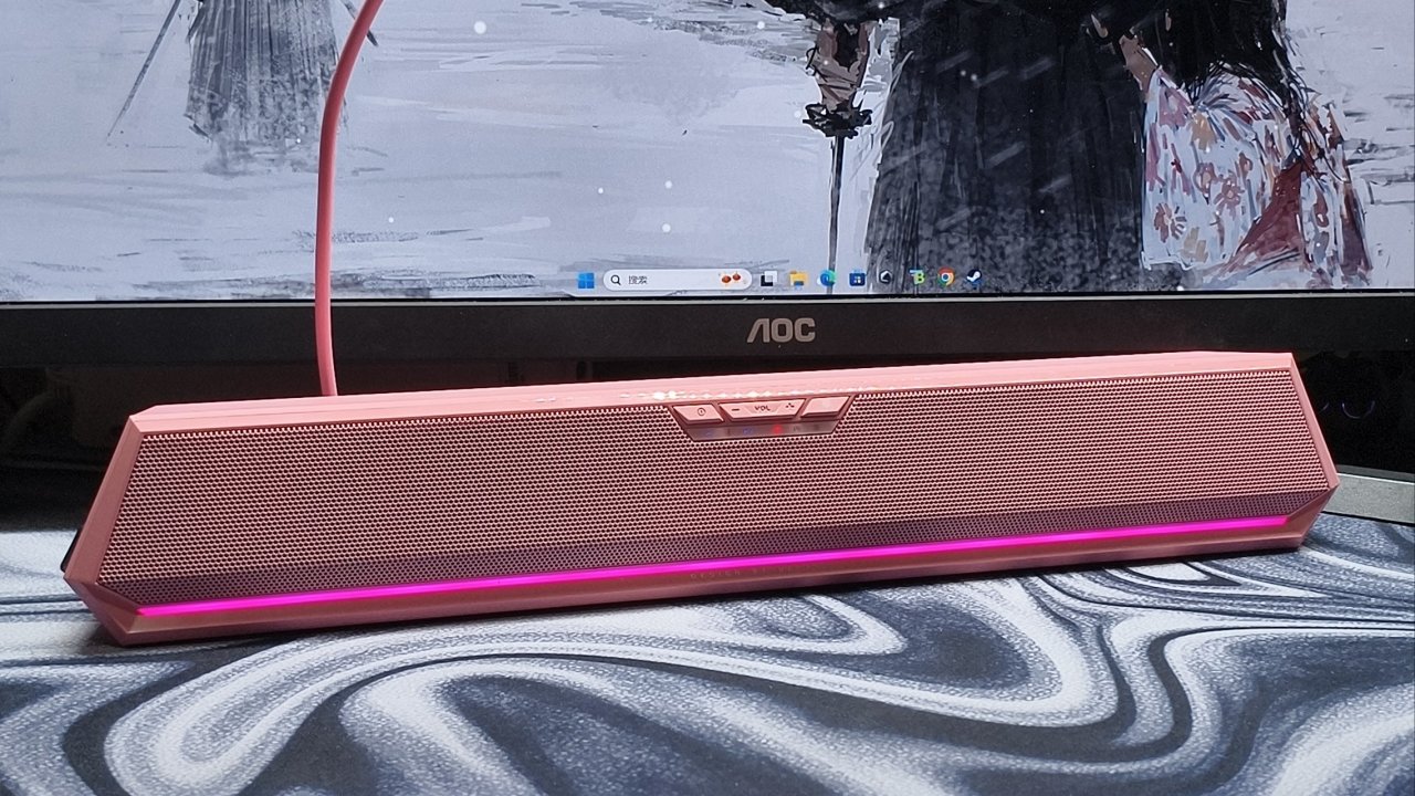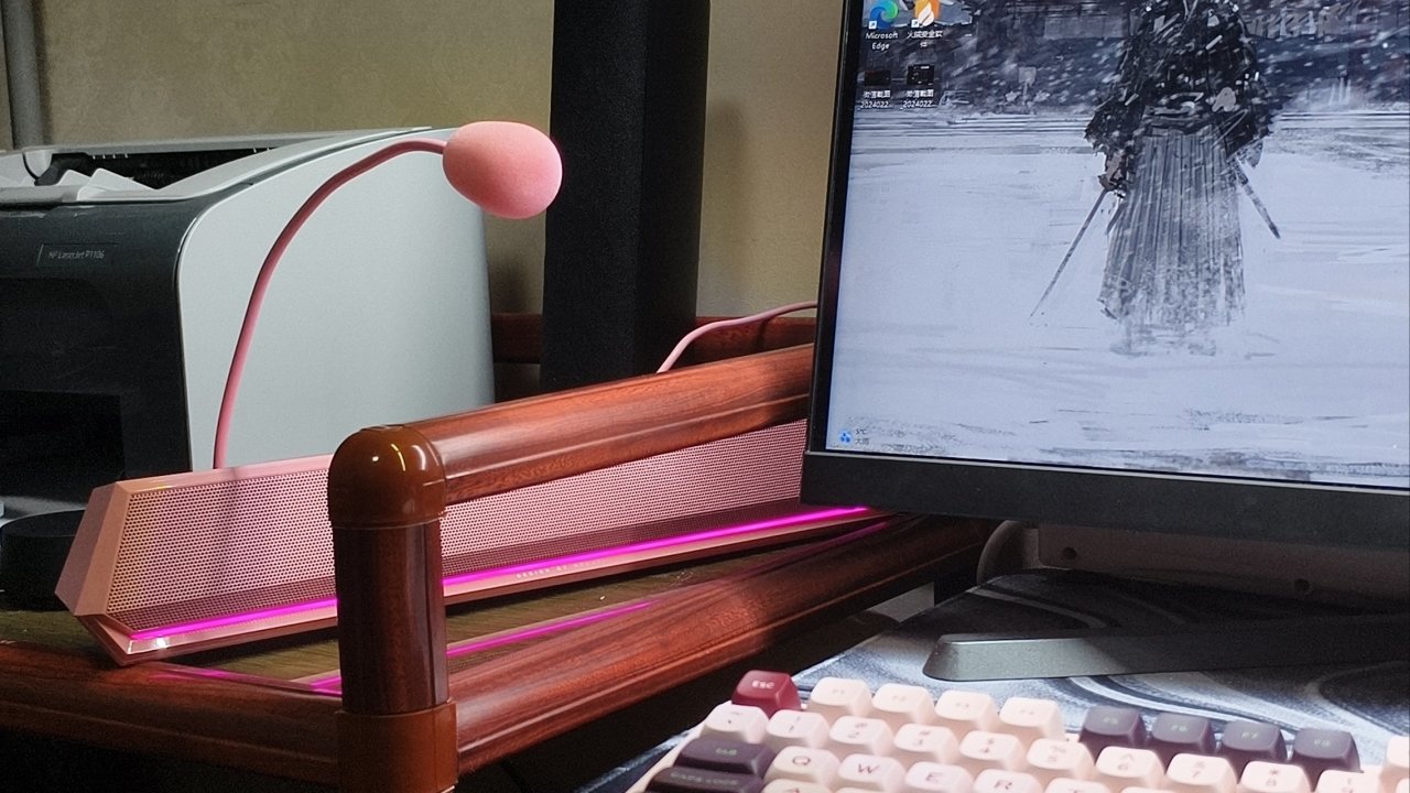 那么下面我们就来聊聊它的实际体验怎么样,他这个音响其实是挺大的,我桌子的宽度是45cm,音响因为略大是不适合放在我这个显示器前面的,会导致你在放键盘的时候手只能尴尬的悬空