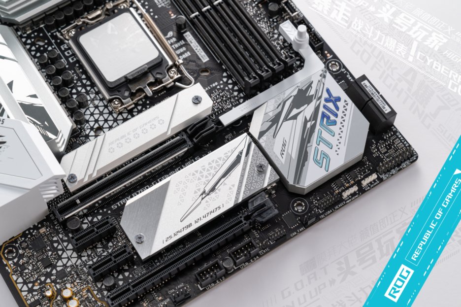 同時主板上的主顯卡插槽加入了高強度合金材質,使其具有更高的穩定性,在安裝高端顯卡使用時能更好的保護插槽。ROG B760小吹雪S依舊保留了備受好評的顯卡易拆鍵,輕輕一按就能取下顯卡,拆裝更方便。