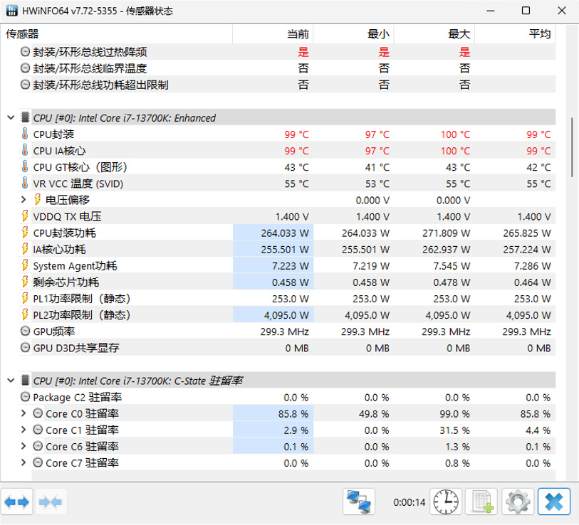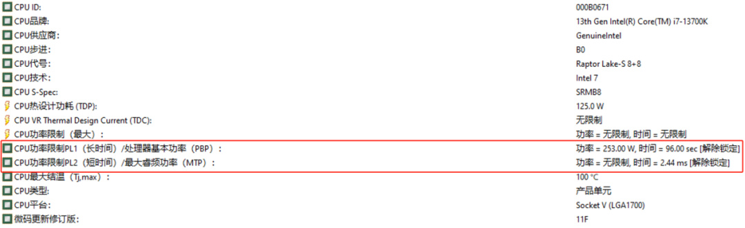 在ROG B760小吹雪S上打開APE 3.0之後,通過HWiNFO軟件可以看到,處理器功率的限制一覽中已經是“無限制”狀態,表明i7-13700K已經處於功耗解鎖狀態,可以帶來更爲強悍的性能表現。
