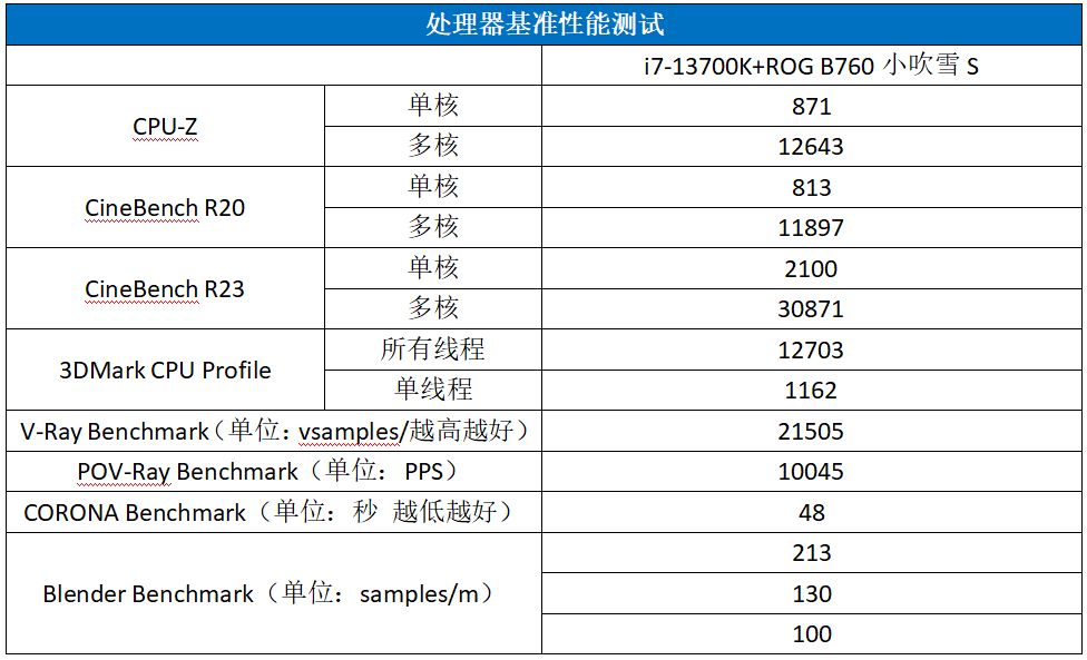 在處理器基準性能測試中,i7-13700K處理器在《CPU-Z》《Cinebench R20》《Cinebench R23》等項目中都展現出了強悍的性能。而在生產力性能方面,i7-13700K在各種生產力軟件中的成績也非常優秀,ROG B760小吹雪S主板完全能夠高端處理器的運行需求。